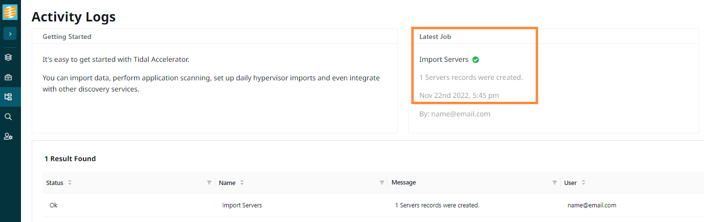 Once the command succeeds you can navigate to your Tidal Workspace URL at https://my_workspace.tidal.cloud/activity-logs to see the results. Use the left menu bar to navigate to Inventory > Activity Logs where the “Latest job” card should say Sync Servers and have the same timestamp as when the sync servers command succeeded.