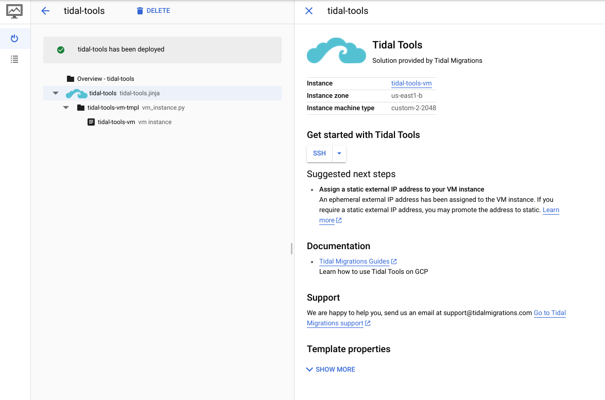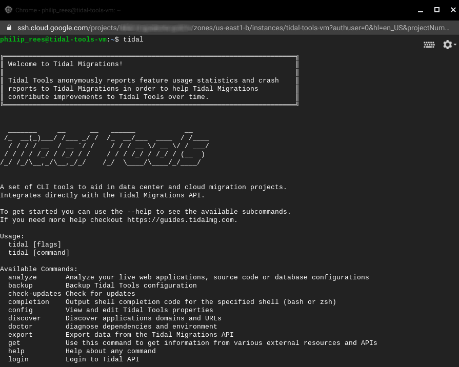 Tidal Tools is used as a command-line interface (CLI) application. To verify and use Tidal Tools, connect to your Tidal Tools GCP Virtual Machine (VM), via SSH, and run the following command: